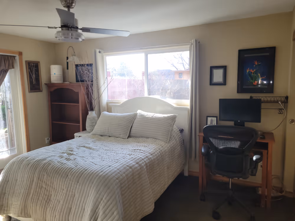 Available on a Month-to-Month Rental Agreement. Private Bedroom (14’x10’). Large closet w shelving. French glass doors access to back yard. The room is attached to the rest of the house. The bedroom door has a lock for privacy. The room is fully furnished with a Full-Size bed, dresser, desk / computer, and TV / stand (TV service not provided).